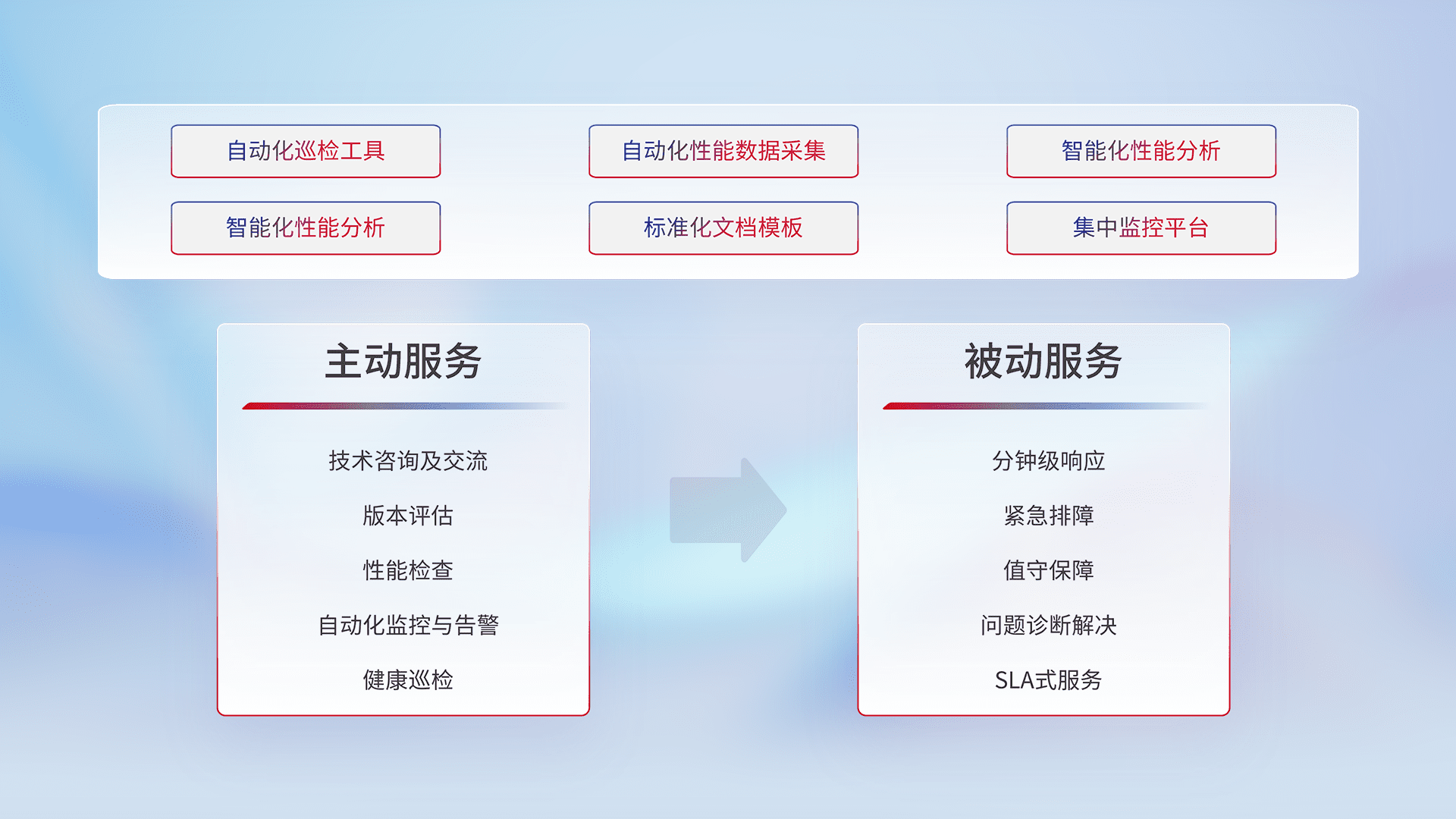 智能化工具和标准化文档,,,保障服务质量,,,,提供主动服务(包含技术咨询、、、、版本评估、、、、性能检查、、自动化监控与告警、、、、健康巡检)和被动服务包含(分钟级响应、、、紧急排障、、值守保障、、、、问题诊断解决、、、、SLA服务)。。。。